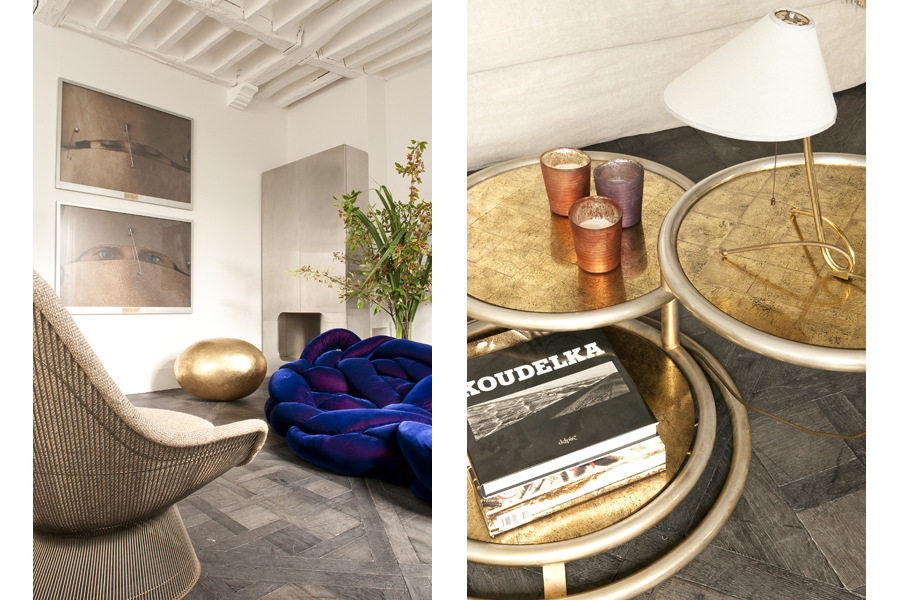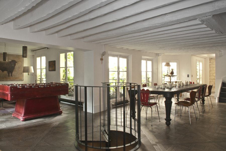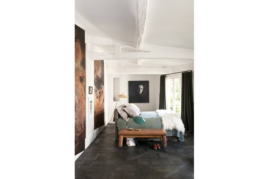 • A carefree mix of flea market finds and contemporary furniture anchors the light filled living room which overlooks the terrace. Original ceilings, painted white, amplify available light and play up the newly installed Marie Antoinette floors in grey.