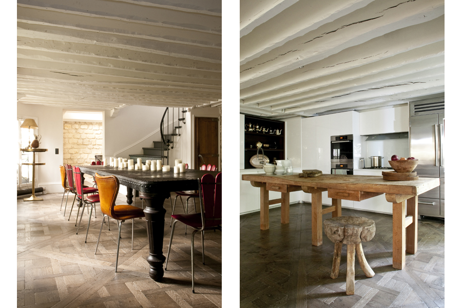 • Fearless mixing—high gloss cabinetry (Boffi Cuisine) meets rustic flea market island—creates tension and dynamic interest in the functional kitchen. The gnarly stool is from Serendipity.