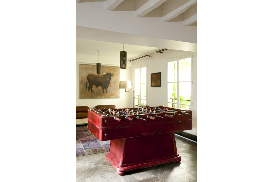 • The vintage foosball table strikes a playful pose near the dining room, which is turned out in more flea market finds.