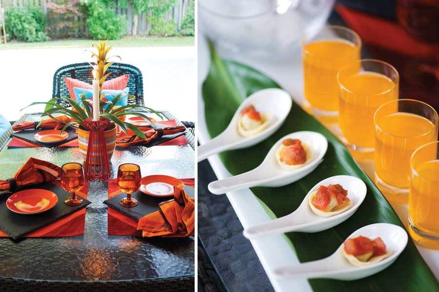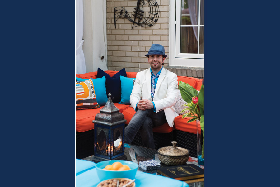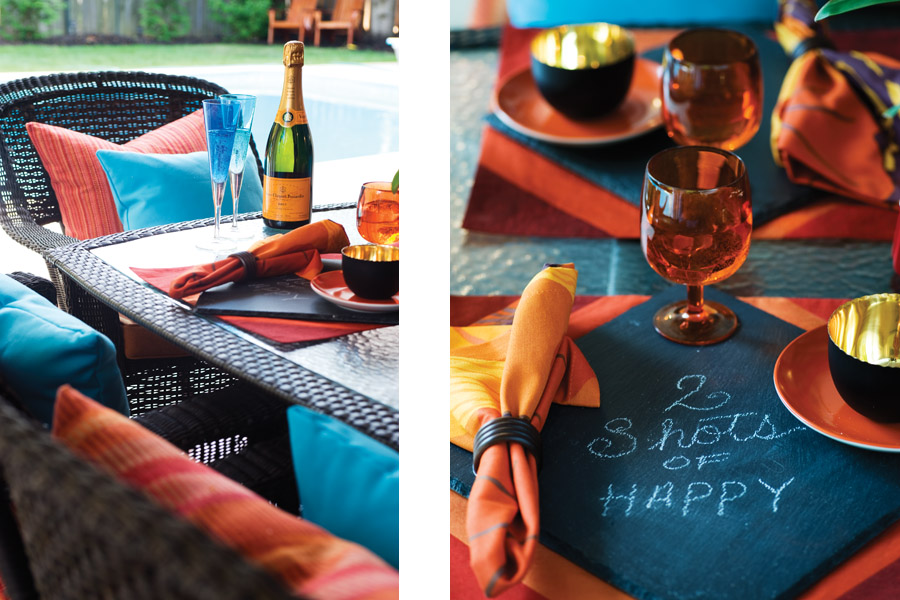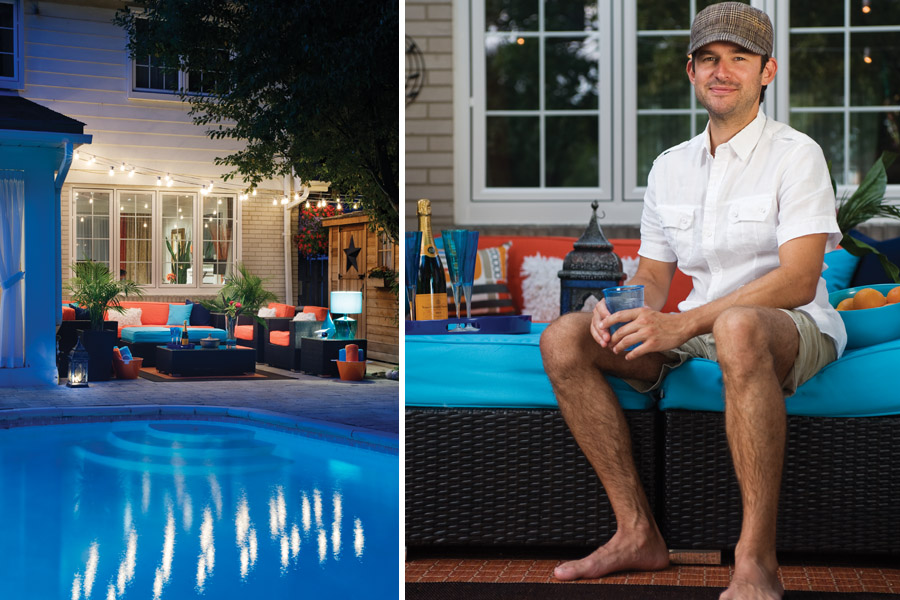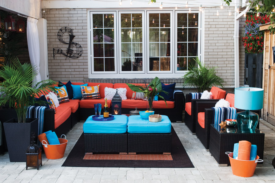 Starting with a great backdrop helps any decorating project and Nicholas was pleased to see the combination of buff brick on the house and terracotta on the patio floor. Against these fixed elements, the daring designer added bold aqua blue and fiery orange to, “Ahem, jazz things up.”