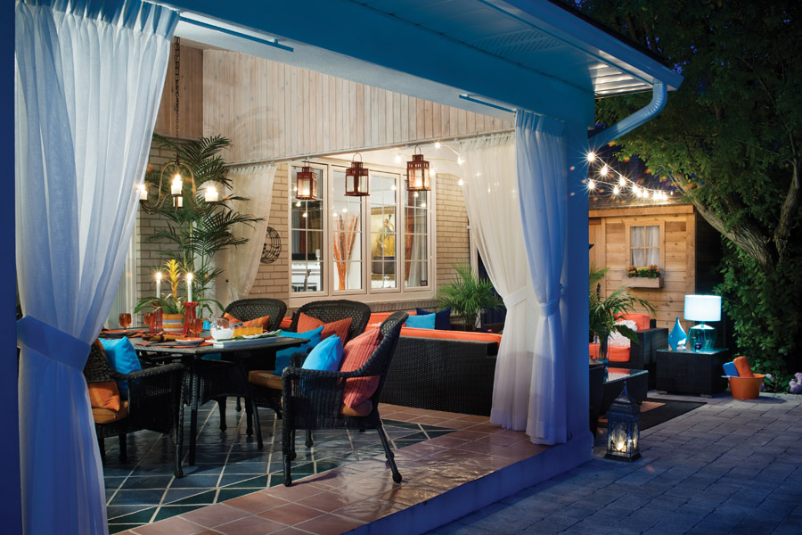 Create a romantic mood by hanging all-weather light strings reminiscent of an Italian piazza or Tuscan courtyard.
