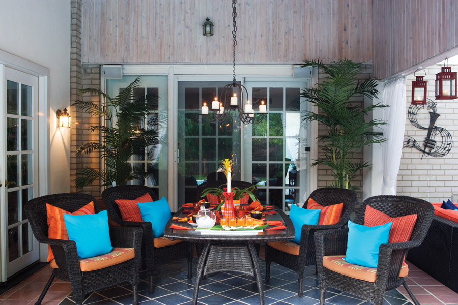 “Orange is current and urbane,” says Nicholas, “and it complements the watery blues of the swimming pool.” To give the casual dining area a sense of ceremony, Nicholas circled its perimeter with breezy white drapery panels by Sunbrite Drapery. Moroccan lanterns lend sparkle to evening events and set an exotic mood.