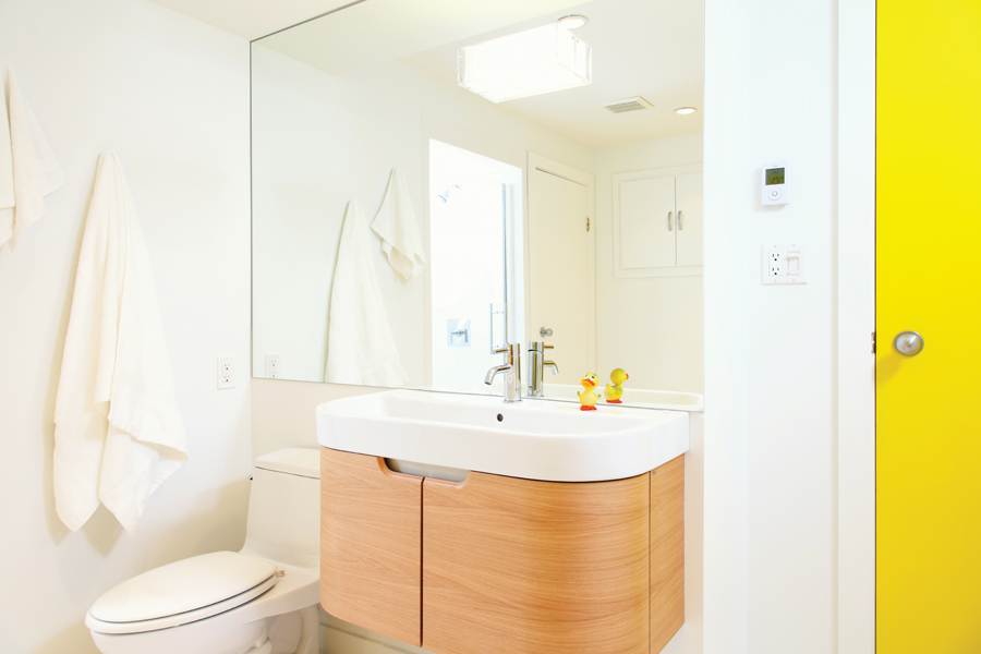 The floors are finished with matte white octagon and dot porcelain tiles which warm the toes, thanks to electric floor heating. The white oak vanity by Roca and the light wishbone chair add natural warmth. The painted yellow door leads to the hallway and the sunny armoire provides storage for linens as well as a spot to hang freshly laundered clothes.