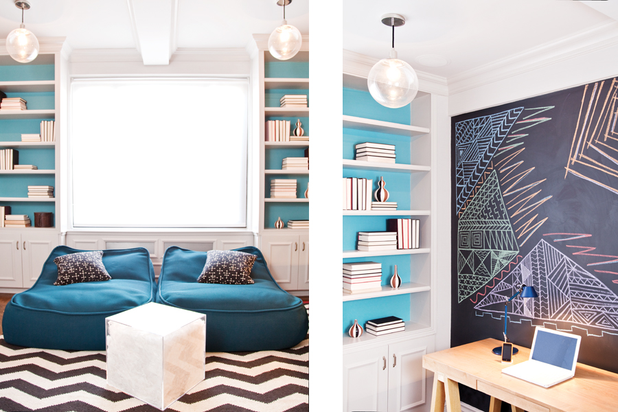 Nathan kicked off the project by creating a unique “Kid’s Study.” He added playful flourishes like the chalkboard paint wall, striped carpet and casual, outdoor lounge seating to stimulate activity.