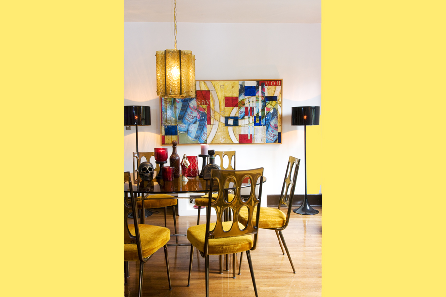 In the living room, books and art rule. “I love the look, feel and smell of books. They have a tremendous influence on me,” Veta confides. Not to be outshone, a tomato red sofa sits opposite the fireplace, a gift from Veta’s friend and hair stylist Michael Fox. The fabric is a New York City flea market find. In the dining area, bold yellow chairs circle an acrylic table on which rest a metal skull, colourful glass bottles and candle holders.