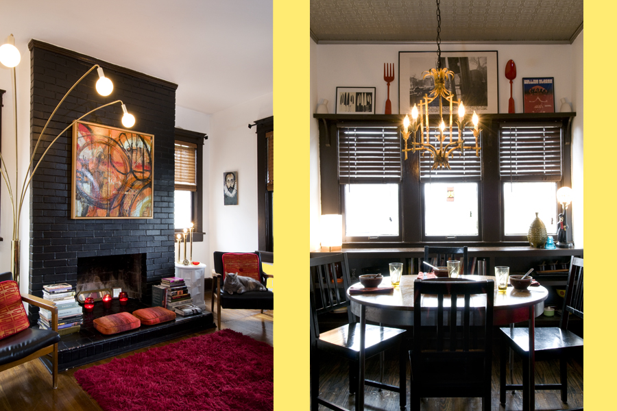 Both Veta and her husband, Theo Antoniadis, are passionate cooks. “When we moved in, the kitchen was a disaster,” remembers Veta. They gutted the original room to the studs and removed five layers of old linoleum before the original pine flooring finally emerged. A vibrant vinyl window treatment on the glossy black door leading to the pantry adds a dramatic accent.