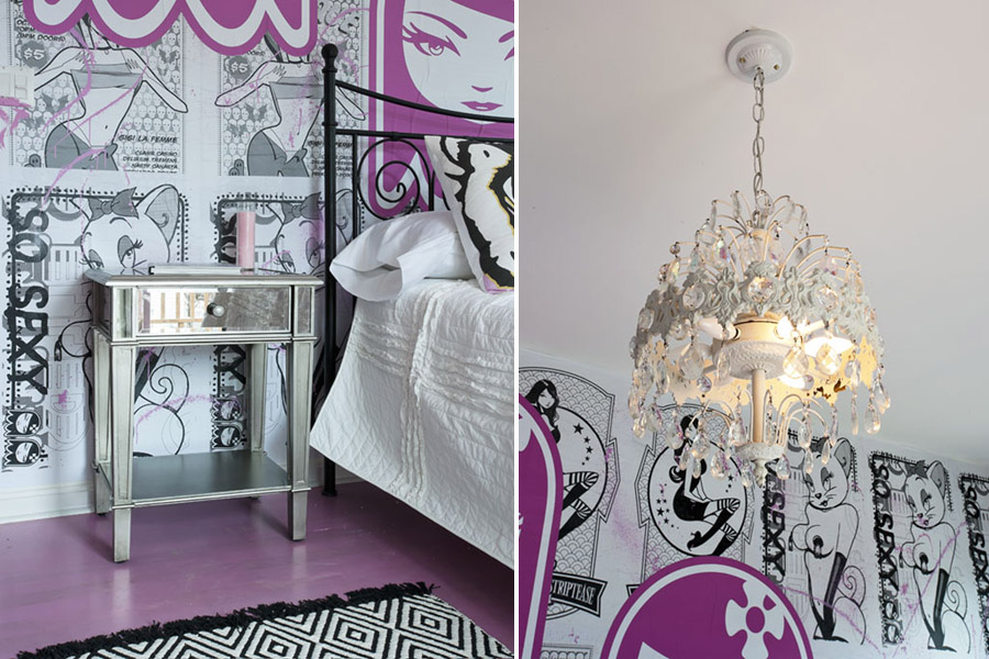 The casual and comfy living room features custom toss cushions soon to be available through the designers’ home décor collection. A dynamic rug, which reads “girrrlll” reflects the clients’ fun side. The floral wallpaper is custom from Flavorpaper and it’s strategically placed to inject style and personality without overwhelming the space.
