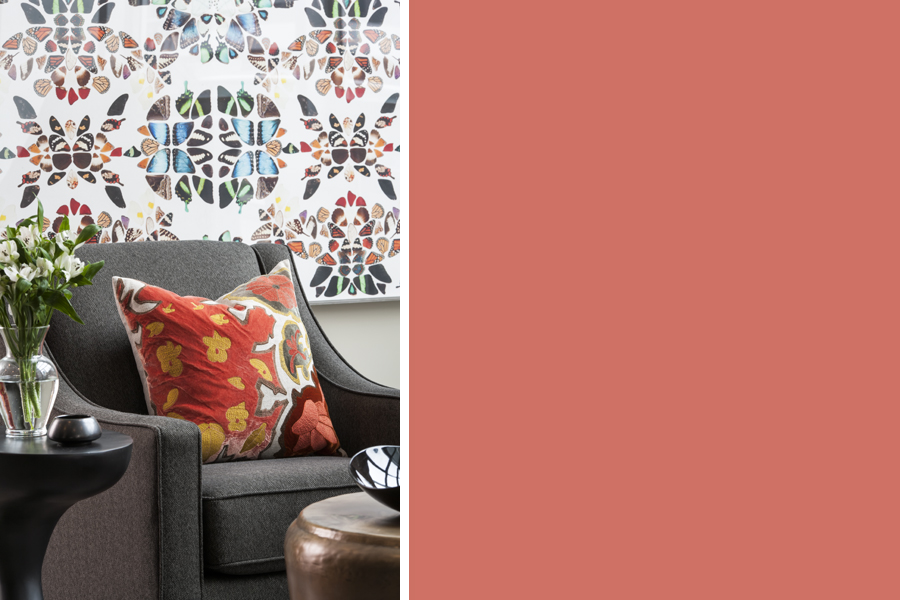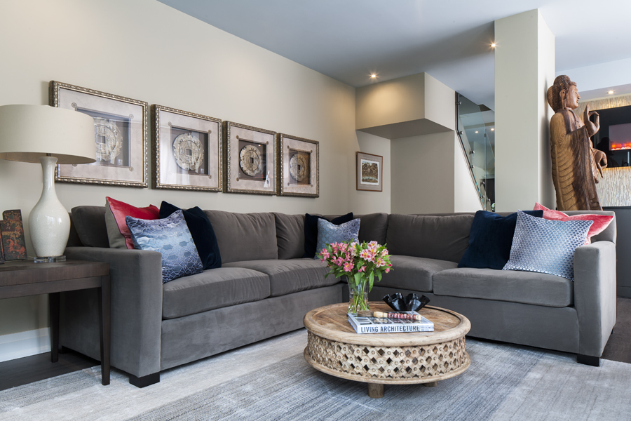 • The comfy grey sectional (Jamie Alexander) surrounds a round wood coffee table from West Elm. Colourful salmon and navy pillows from ELTE fill the space with colour.