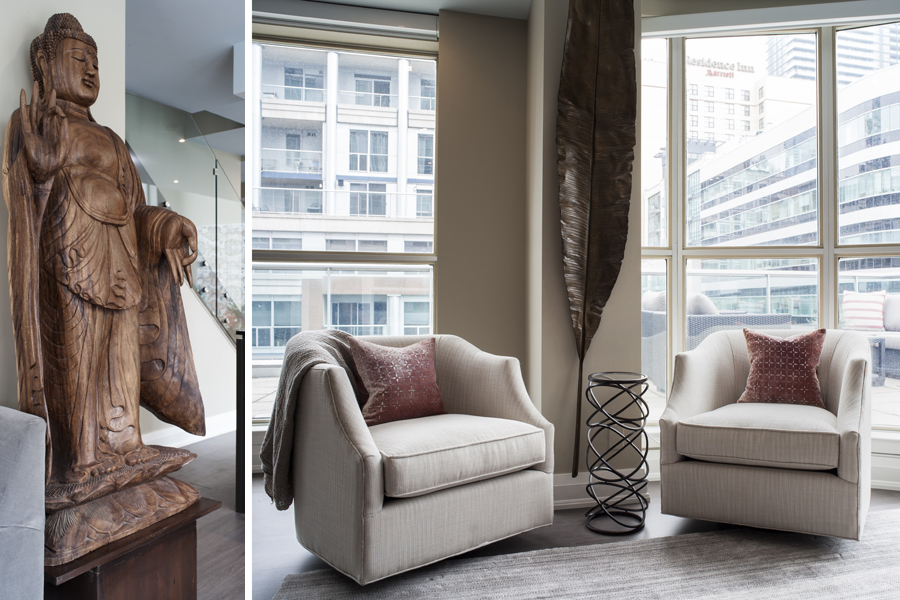 • It's not uncommon to find large columns poorly placed in new condos but again, it makes decorating a wee bit more challenging. To give the column a sense of purpose Kimberley placed a tall wooden Buddha in front of the structural feature.