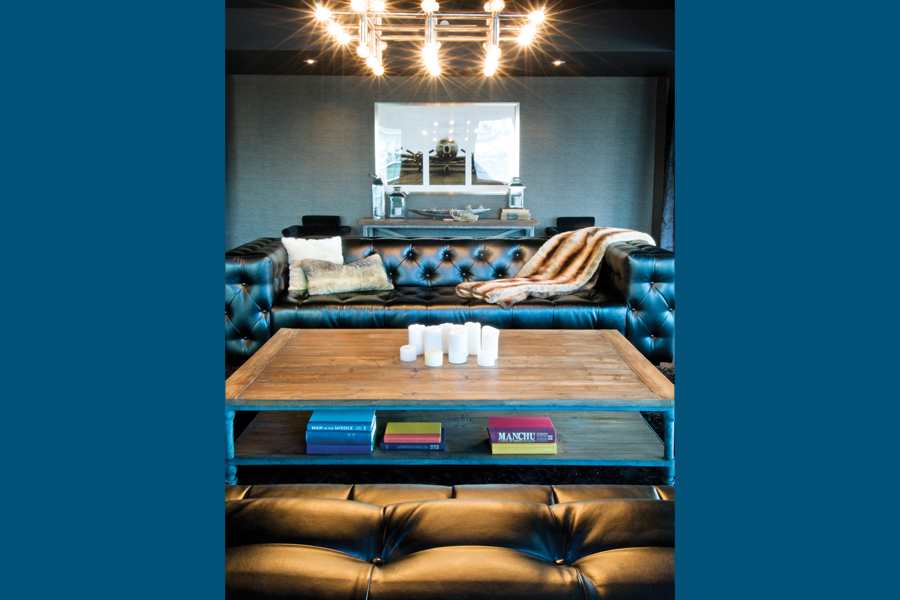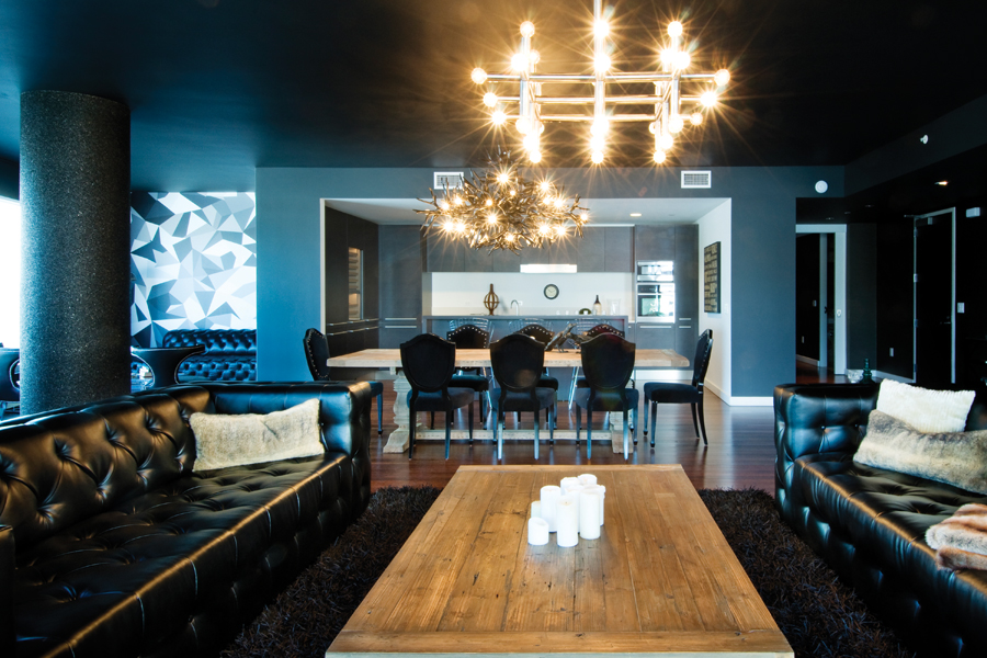 • Oversized lighting underscores the masculine drama. An “antler” chandelier shines above the dining table while a 70s grid illuminates the living room.