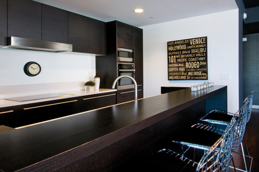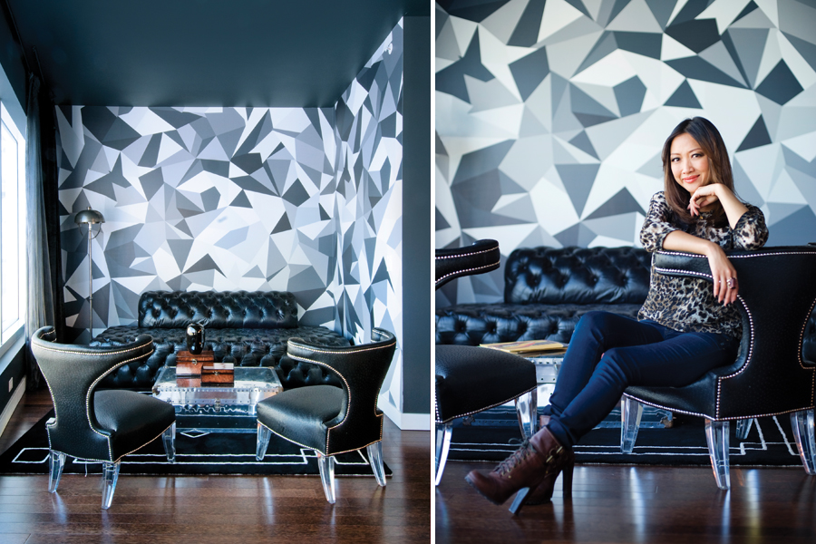 When asked, Kahi describes the condo’s style as, “Rough Luxe.” Though it’s masculine in appearance, it’s not without its glamour. Decadent touches include the faux fur throw on the living room sofa and the grass cloth covered walls with just a hint of iridescent sheen.
