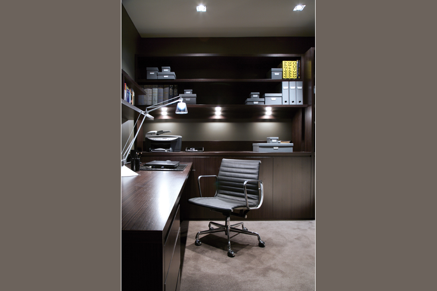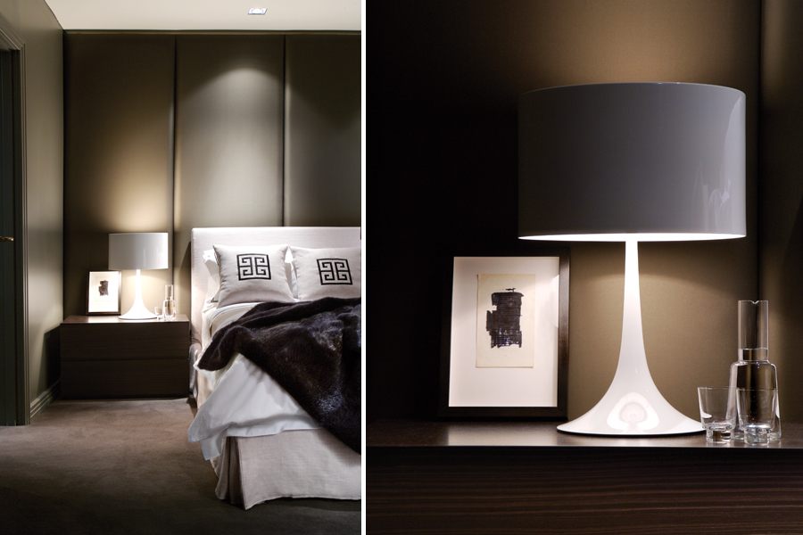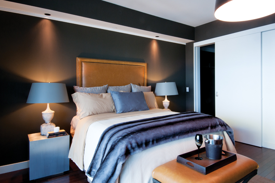 Bedroom walls are seductively panelled in a sophisticated silk textile, custom-dyed to match the paint finish on adjacent walls. Not only does the treatment create a cozy environment for sleeping, it’s an effective way to dampen noise as well. Underfoot is a cozy taupe carpet.