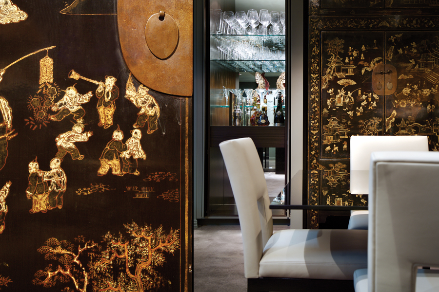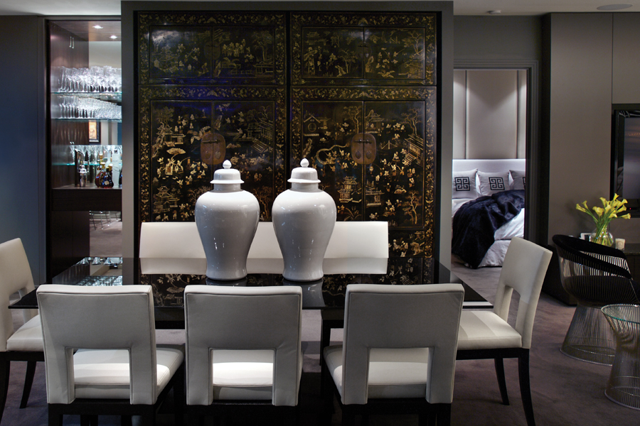 In the dining room, eight alabaster leather chairs border the gleaming black table, ready to accommodate the owner’s frequent dinner parties. Two vintage Chinese vases from a local antiques dealer sit on top. “We purposely chose white vases to add a spark,” says Steven.