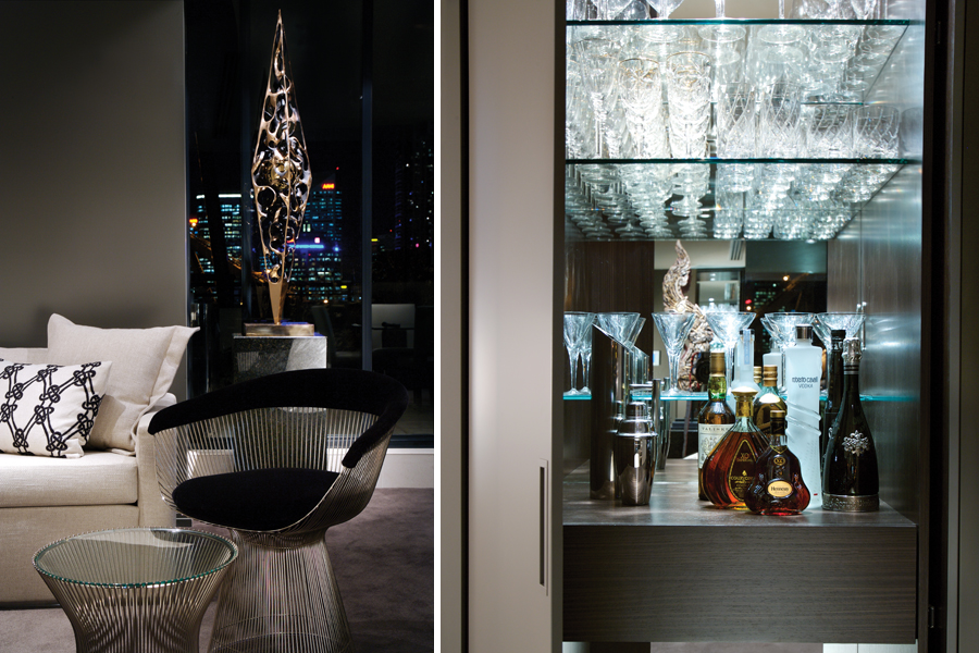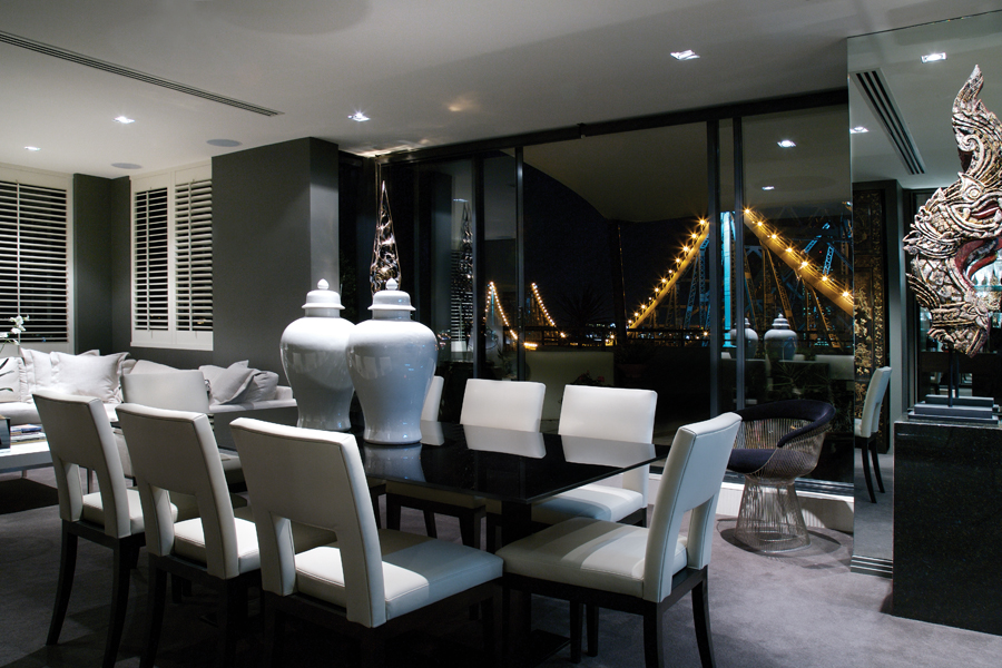 Perched high on the cliffs in the Brisbane suburb of New Farm, this penthouse condo with its stylish “cocktails-at-five” mood reflects the talents of Australian designer Steven Stewart. The quiet inner-city dwelling suits his client’s busy lifestyle. As a bonus, it’s also an ideal meeting spot for friends to gather before heading out for a late dinner at one of the area’s fabulous restaurants.