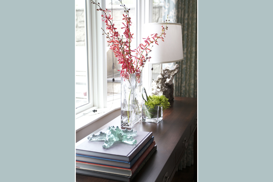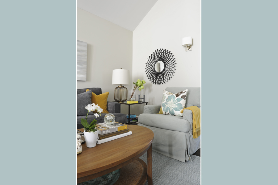 • The sofas with fabric from Kravet are custom through Elle Design. The stone top coffee tables are from Ethan Allen. Wall colour, Pittsburgh Paints Ostrich Feather.