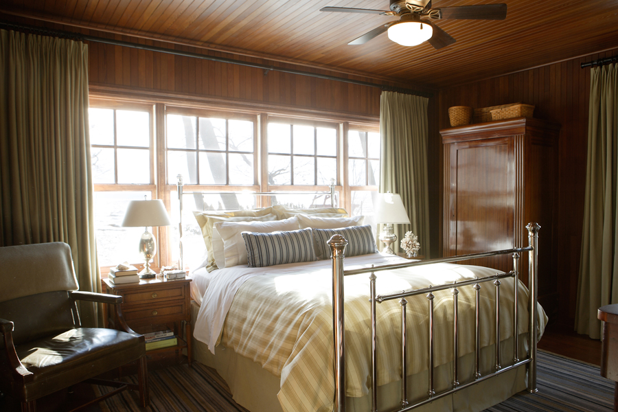 • Simply furnished, the master bedroom gives way to a large deck, ideal for family barbecues and summer sunning. Culley painted existing grass cloth covered walls a crisp white, preferring the subtle texture to flat drywall.