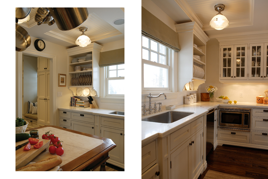 All kitchen tools—pots, pans, plates and cooking utensils—are easy to grab from the storage shelves on the island and the wrought iron racks hanging above. Architectural trim details, vintage lighting and hardware are inspired by the cottage’s original 1920s architecture. The island features a marble surface, ideal for baking as well as sturdy counter space. Cabinetry finishes are hand painted and, if they chip, can easily be touched up.