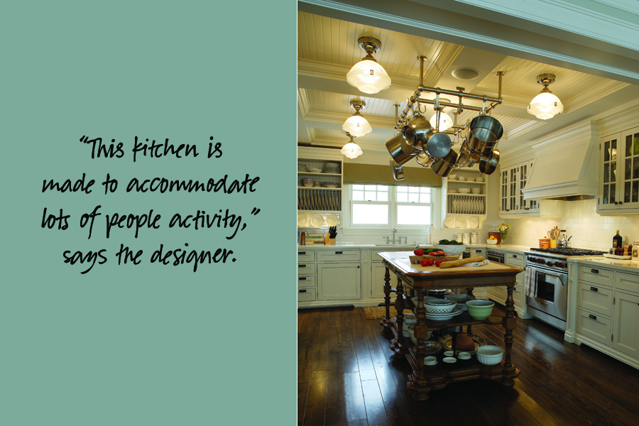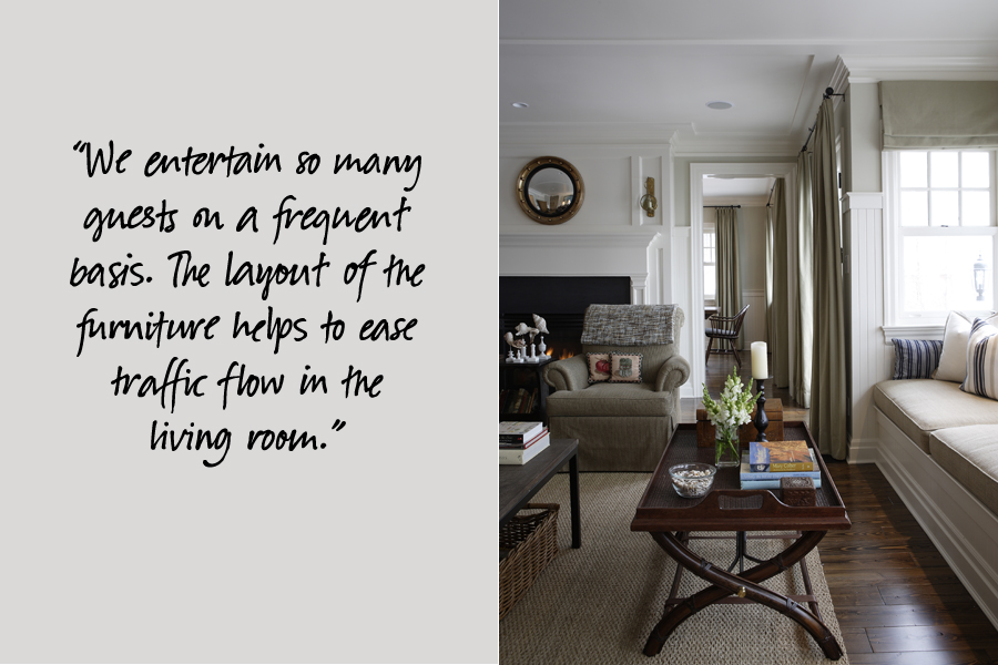 To maximize seating for evening and weekend gatherings, the bright and cozy living room is smartly laid out with comfy sofas, plump armchairs and large coffee and occasional tables. A long pillow-topped banquette borders the front windows. Fabrics are a mixture of durable woven textures and kicky cottage stripes and prints.