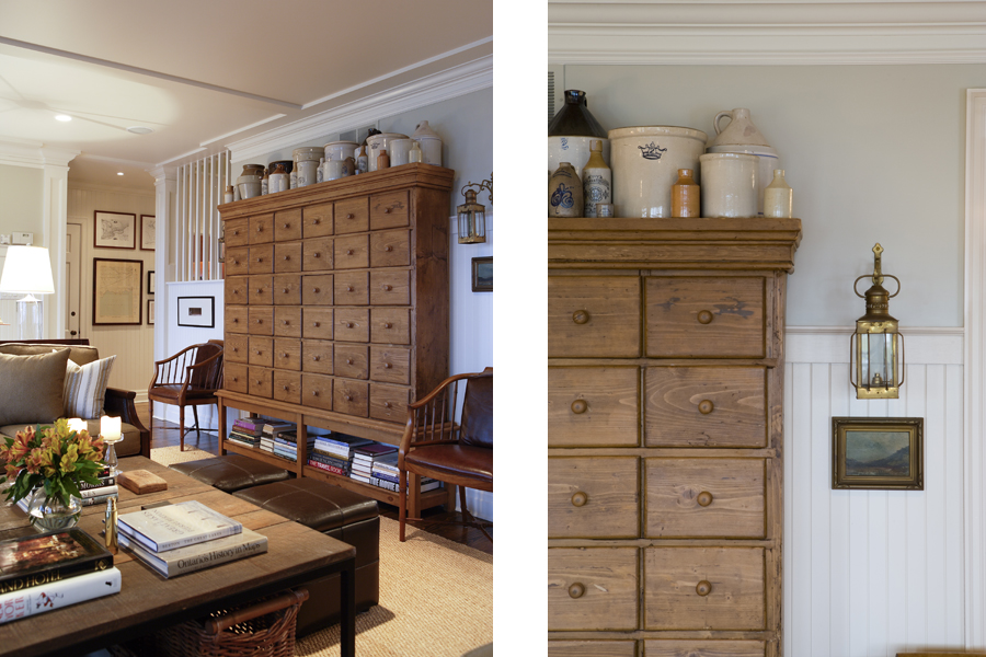 • An eclectic display of crocks sits atop an antique storage cabinet. The sconce is a vintage gas lantern. The turn-of-the-century Canadian landscape painting sits against cream wainscoting and below soft gray-green on the walls.