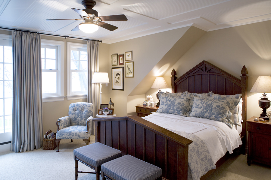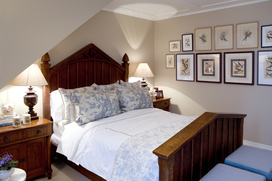 • The roofline dictates an unusual angle above the vintage headboard from Patina Antiques. Twin ottomans in slate blue fabric rest at the foot of the bed.