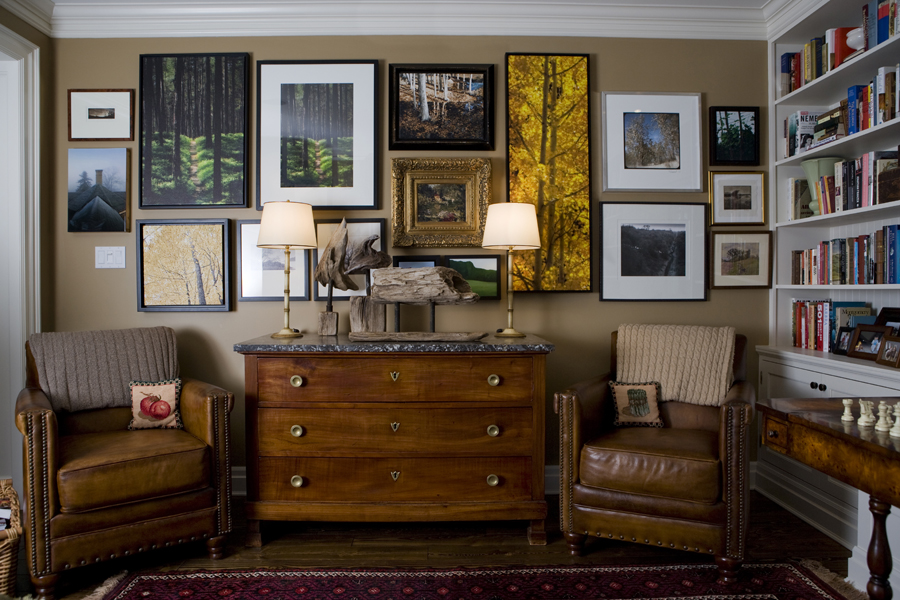 • This chair was found at Antiques at the Factory and the busy mother of two fell in love with the artisanship behind its elegant shape. The oil painting is by Danielle Rahe Fox, an artist from the Ingrams’ hometown of Santa Cruz, California. Family, as displayed in the homegrown gallery rising above the main floor staircase, is a priority for Culley and her husband, songwriter and music producer Jason Ingram. Daughters Blythe and Nola are much in evidence throughout the home.