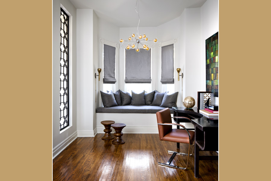 • Dabble Savvy: Turn a singular window seat into a destination with furniture and lighting. The walnut stools anchor the seating arrangement and the glass globe chandelier and plug-in sconces provide a flattering layer of light.