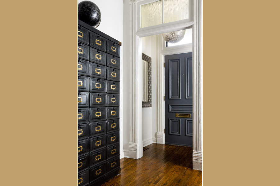 When storage is at a premium, take advantage of available floor and wall space. To capture vertical storage, position a tall bookshelf or étagère (similar to a bookshelf, an étagère is an open shelving unit meant for display) against the hallway wall. Now, decorative objects such as the antique wooden boxes, leather books, and personal mementos are in clear view.
