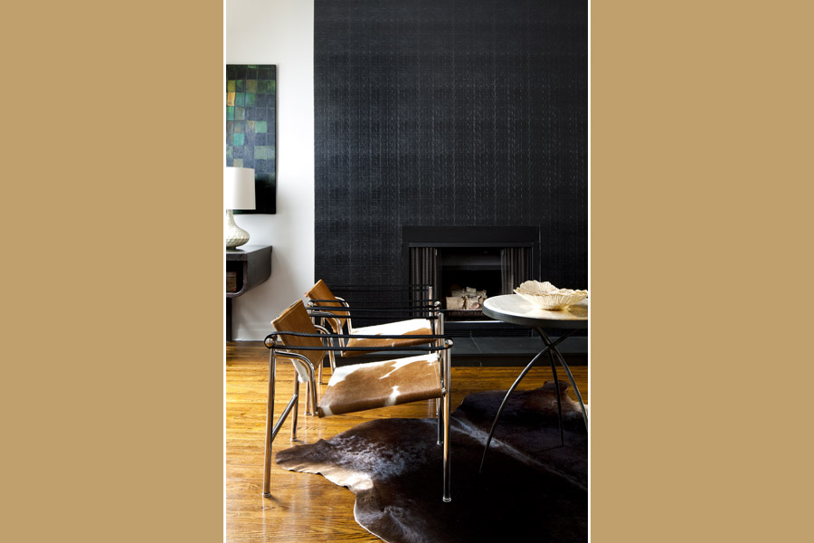 • In this space, Yanic repurposed the metal art mirror above the sofa where it becomes a focal point. Benches create bridges between different zones within an open concept space. The black leather tufted bench is part of the conversation grouping and an extra seat near the fireplace.
